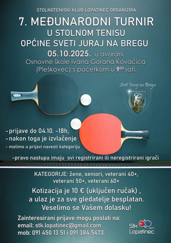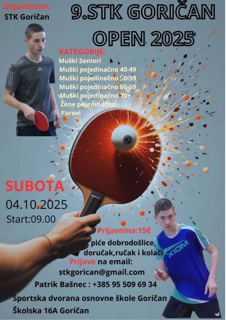 Turniri Turniri u listopadu – Goričan i Lopatinec 5 days ago voditelj 9. STK Goričan OPEN 7. Memorijalni turnir u stolnome tenisu Općine Sveti Juraj na Bregu Tags: Goričan Lopatinec turniri Continue Reading Previous Turniri u rujnu – Šenkovec, Sveta Marija, Belica